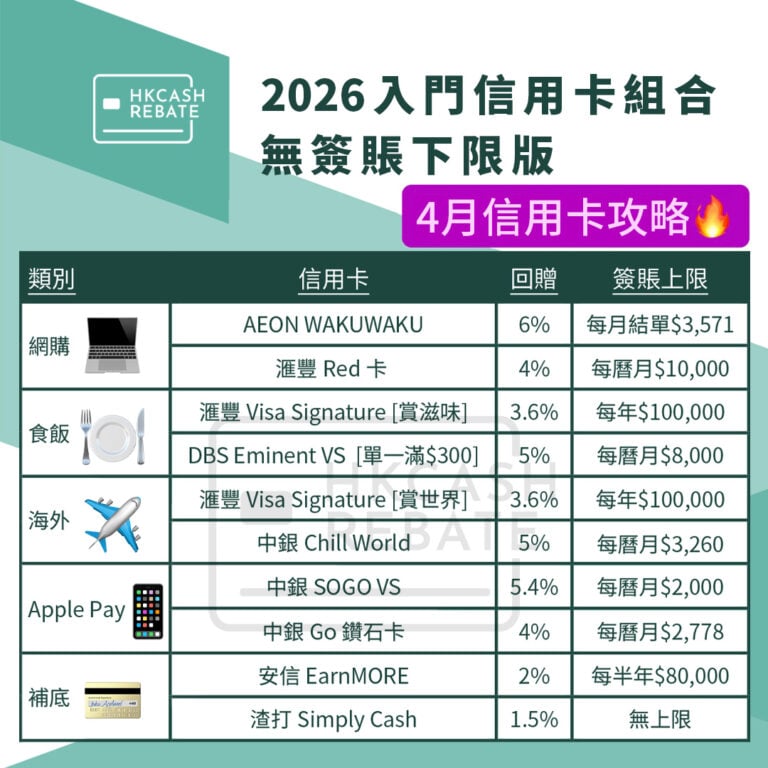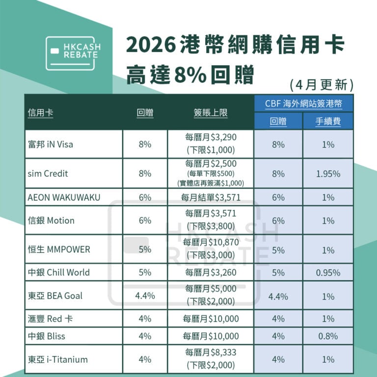 ![[外幣網購信用卡攻略] 2026網上外幣簽賬信用卡比較!連回贈/手續費](https://hkcashrebate.com/wp-content/uploads/2026/03/Online-Overseas-768x768.jpg)