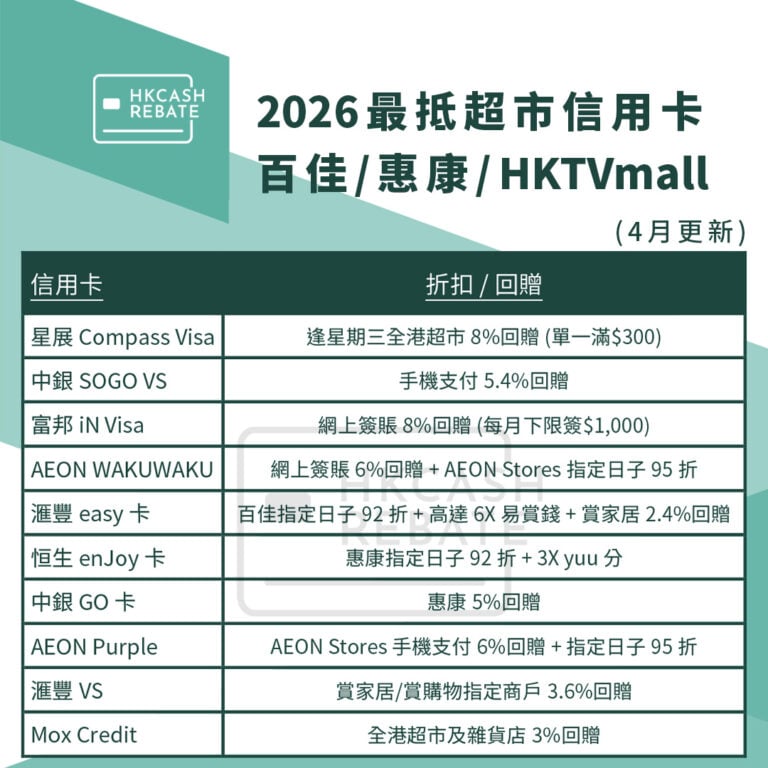 ![[2026超市信用卡攻略] HKTVmall/百佳/惠康/Aeon信用卡優惠比較](https://hkcashrebate.com/wp-content/uploads/2026/03/Supermarket2-768x768.jpg)