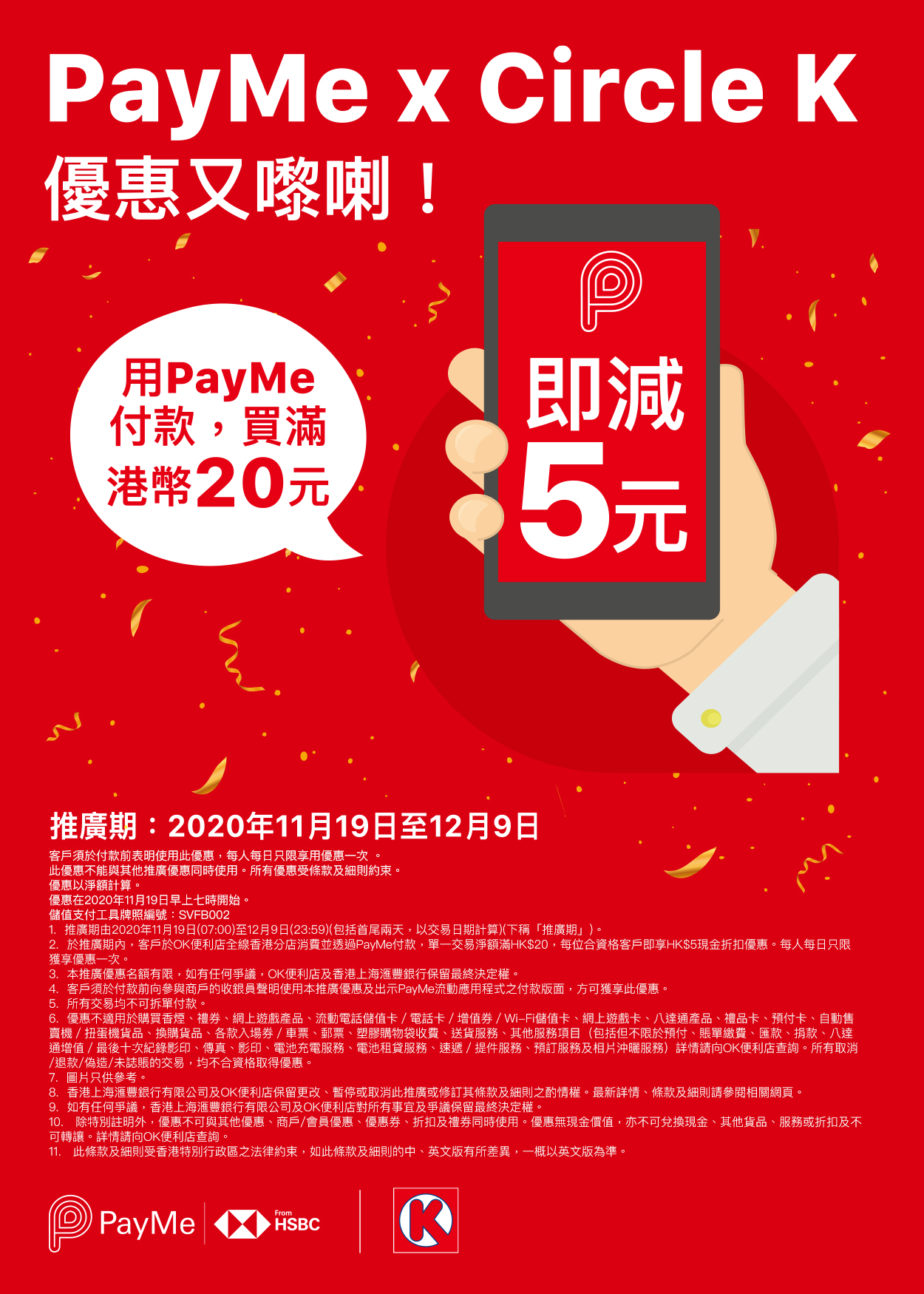 優惠期由2020年11月19日至12月9日,只要以PayMe喺OK單一付款滿$20,就可以享受$5折扣!