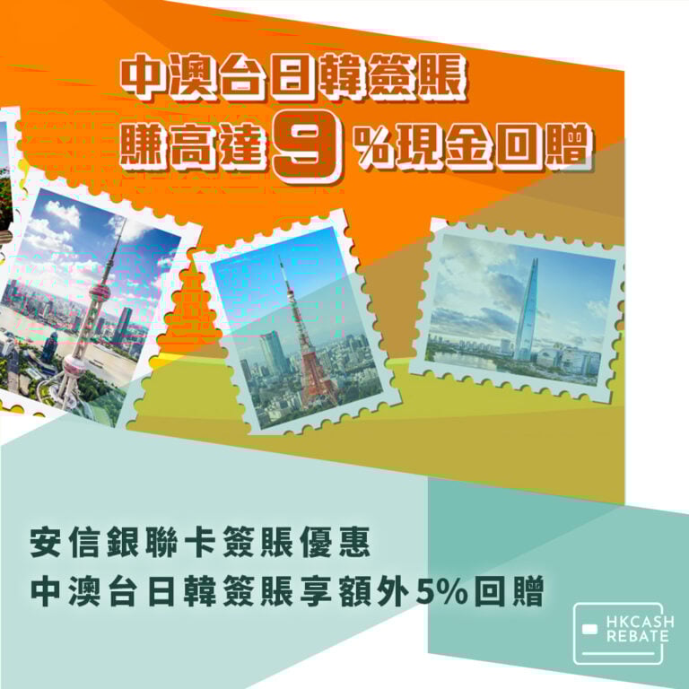 安信出咗個勁抵嘅中澳台日韓簽賬優惠,如果暑假會去旅行就啱晒!憑安信銀聯卡喺中國內地、澳門、台灣、日本及南韓以當地貨幣作實體店簽賬單一滿HK$100,就可享額外5%現金回贈!夾埋EarnMORE卡本身2%回贈就係7%回贈,或者夾埋WeWa卡揀中類別更加係9%回贈!每張卡每個月最多可以簽$10,000!