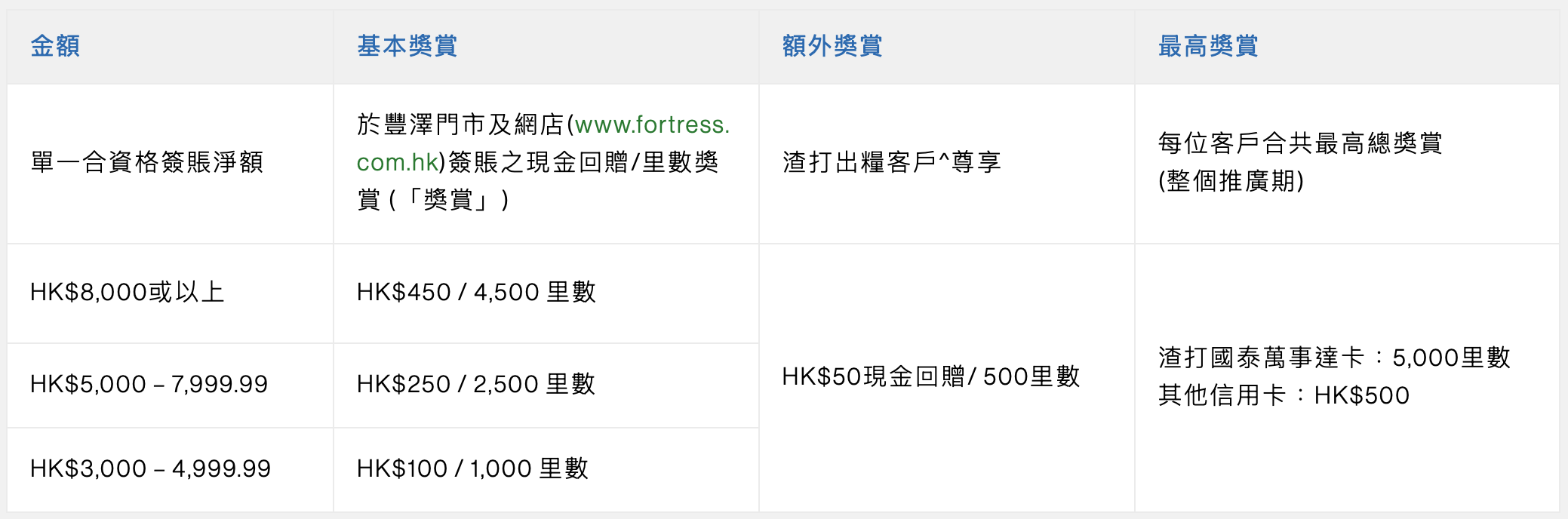 推廣期由至2025年9月1日至10月31日,一經登記,憑渣打信用卡於豐澤門市單一簽賬滿$3,000,可享以下回贈: